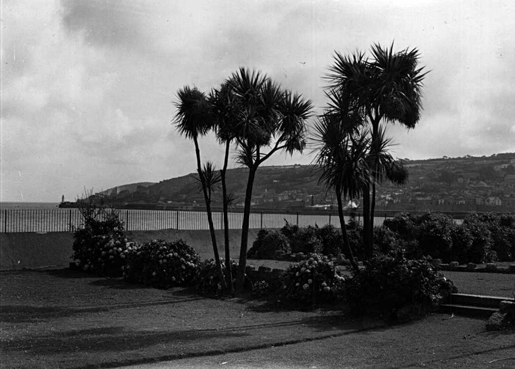 Description: This photograph could have been taken for a tourism guide or for a postcard to promote Penzance as a seaside tourist destination with parks and gardens and a warm winter climate. The dracaena trees suggest a tropical climate beside the sea. The Robin Bolitho Gardens were opened on a former industrial site in 1914, were rebuilt after the Ash Wednesday storm of 1962, and have adapted to the needs and taste of both the locals and the tourists.