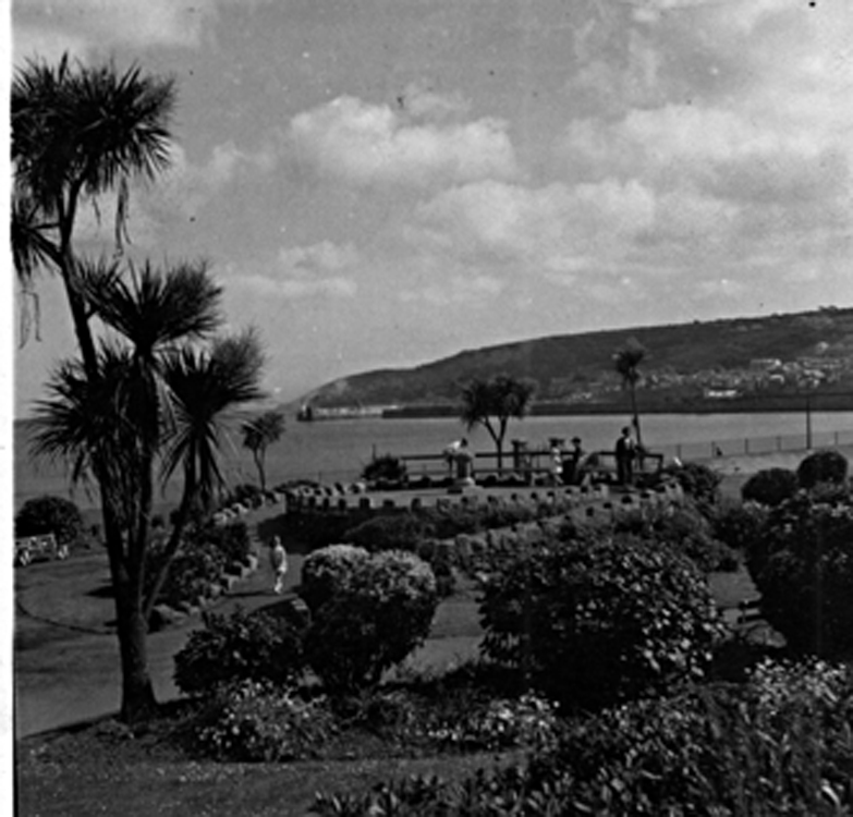 Description: This photograph could have been taken by Sweetman or Churchward for a tourism guide or for a postcard to promote Penzance as a seaside tourist destination with parks and gardens and a warm winter climate. The Bolitho Gardens were opened on a former industrial site in 1916, were destroyed by the Ash Wednesday storm of 1962. The raised area was used as a viewing platform or bandstand.