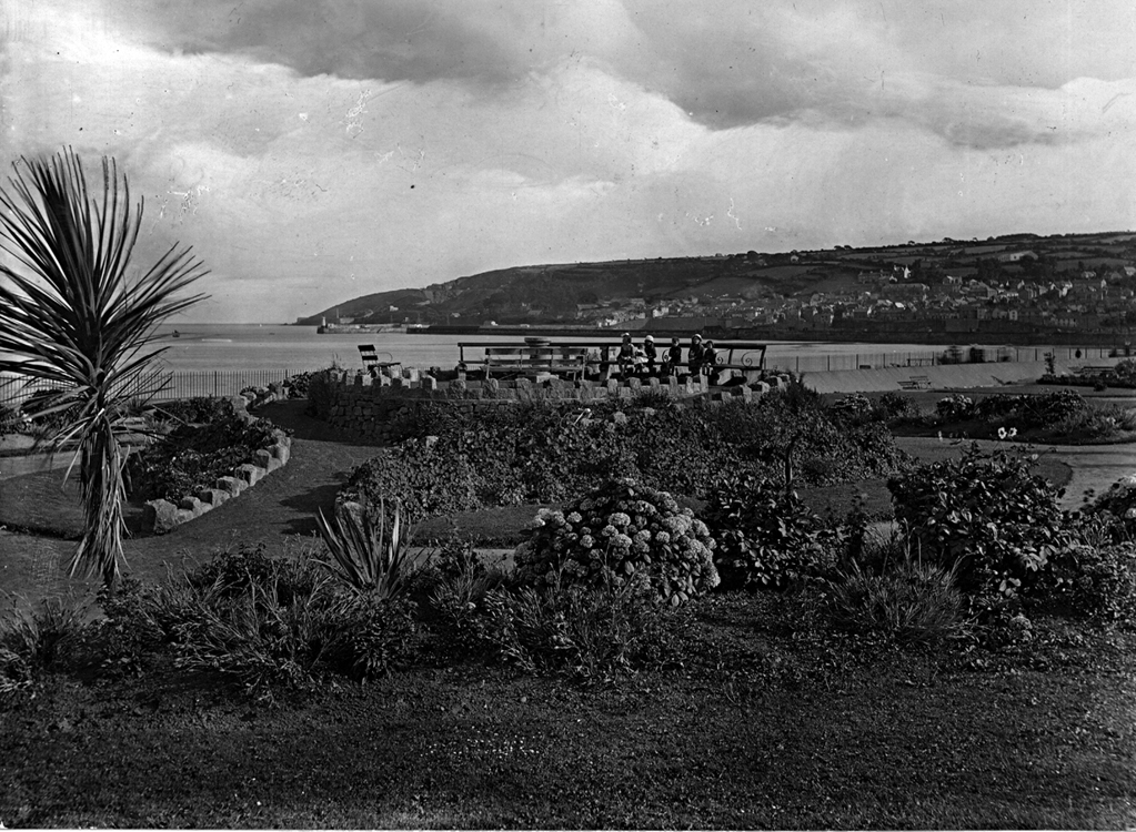 Description: This shows the Bolitho Gardens, Penzance which were built on the site of the former Serpentine Works, Wherrytown re-using much of the stone. The gardens were opened on Empire Day 1916 and destroyed by the Ash Wednesday storm of 1962. Looking towards Penlee Point, the vegetation growth suggests a day in summer after its opening in 1916.