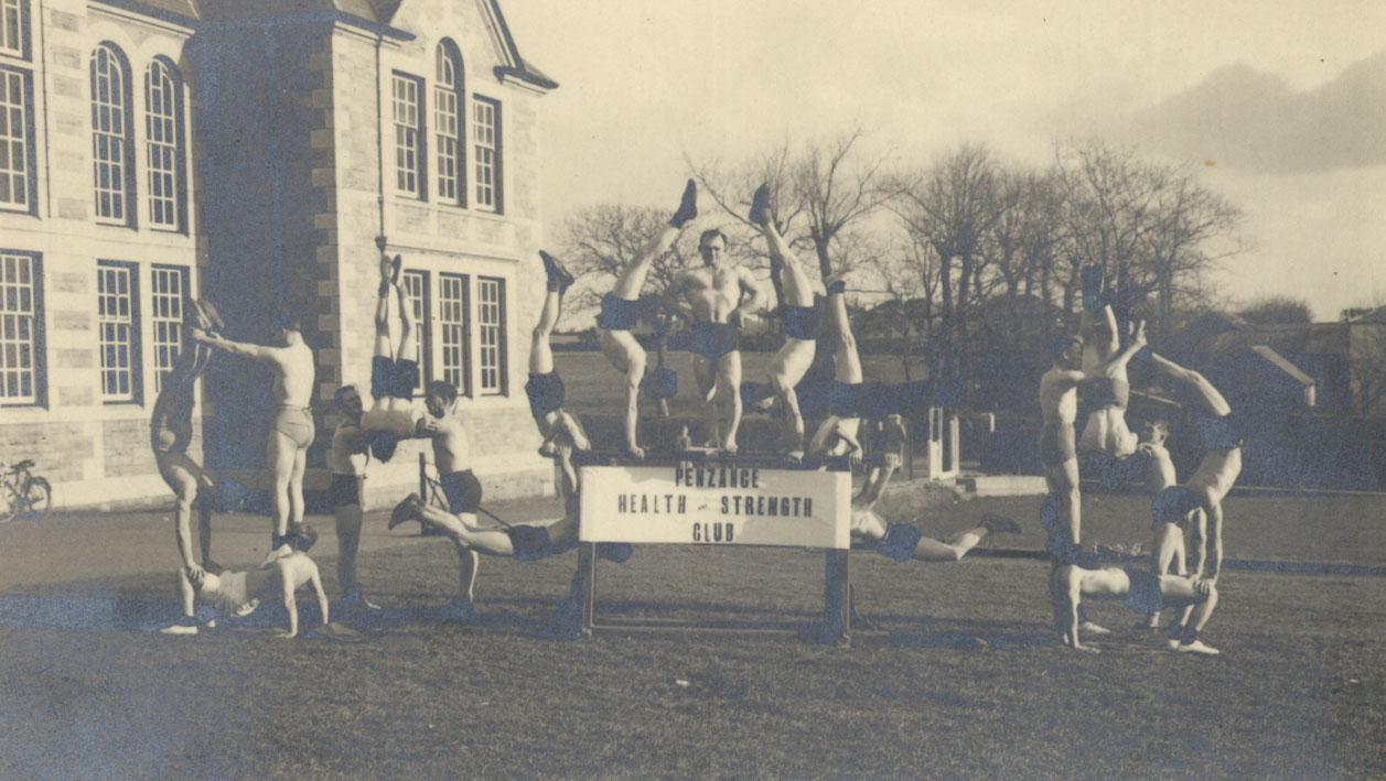Description: Penzance boasted a water polo club for young and fit men and this club was seen as an extension to obtaining a high level of physical fitness. This posed photograph of the Penzance Health and Strength Club appears to be a promotional shot, possibly taken by Richards and Sons. The figure 6th left looks remarkably like Reg Richards.