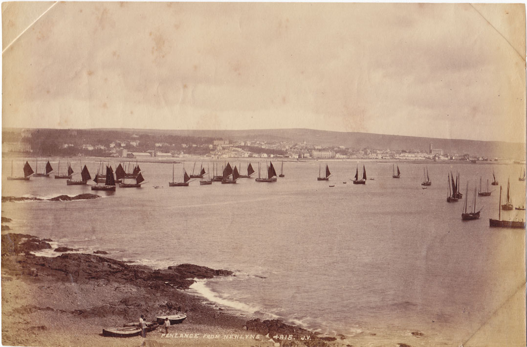 Description: The cabmen’s rest has a glass roof at this stage. The hoarding outside Symon’s Chemist’s advertises the Jarvis Building built in 1893; West Cornwall Steam Laundry which opened in 1901 and was renamed in 1905 Penzance Sanitary Steam Laundry; Taylor’s Motor and Cycle Works, knoen by this name from 1906 to 1909; Symons Cough Syrup, first advertised in 1887; Thorley’s Cake which was first advertised in the October 1902 edition of the Cornishman; Howell Mabbott, Phoenix Stores which traded until 1936; Oxo, the name registered in 1900