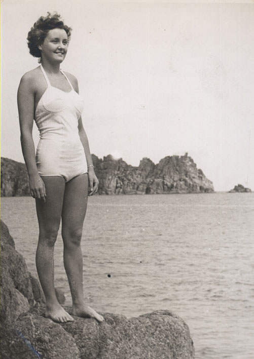 Description: This photograph was taken for the local tourism guide and shows a lady standing on rocks on Porthcurno Beach at half tide.