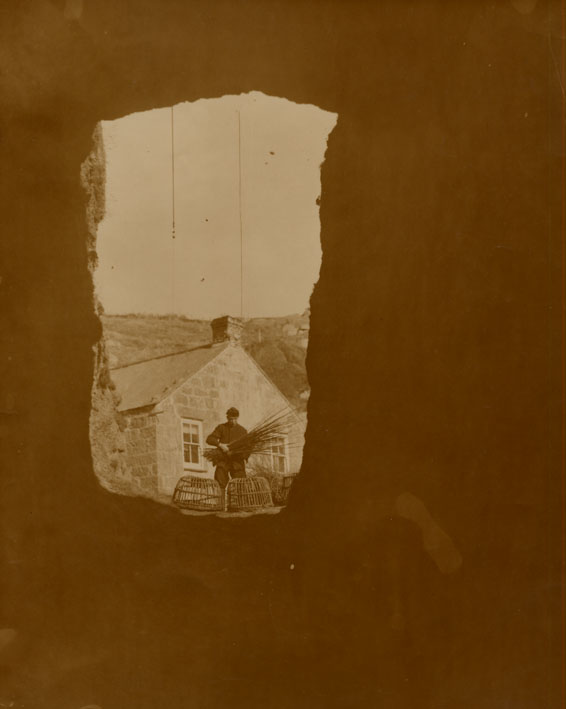 Description: Through the keyhole rock drilled by miners to ease the access to the cove at Porthgwarra, a fisherman stands, withies in hand, behind two crab pots.