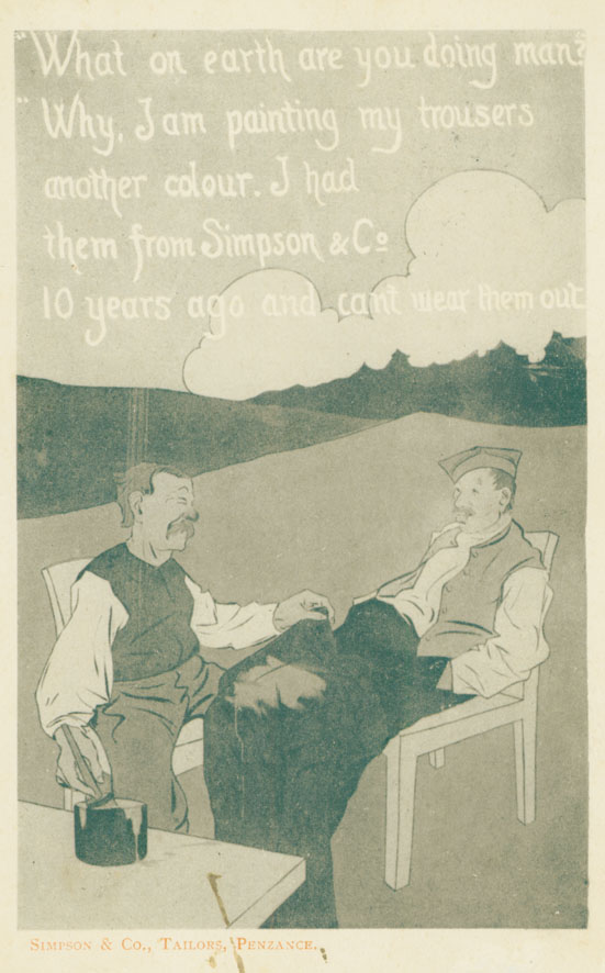 Description: Two men are seated outdoors beside a table on which is a pot of paint. One says to the other,"What are you doing man?" He replies, "Why I am painting my trousers another colour. I had them from Simpson and Co (10 decades/years ago? - the writing is very faint.) Printed underneath the picture is Simpson and Co., Tailors, Penzance