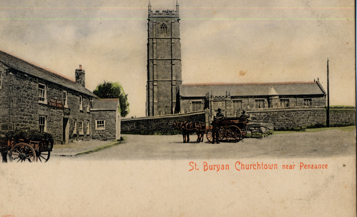 Description: St Buryan Church town. A church has stood on the current site since c. 930 when King Athelstan stopped to pray at Saint Buriana's chapel, of which little now remains, during his conquest of Cornwall prior to his campaign against the Scilly Isles. He vowed to erect a college of clergy where the oratory stood if God blessed his expedition with success. Upon his triumphant return, having subdued Scilly, Athelstan endowed a church in honour of Saint Buriana with a charter that established St Buryan as one of the earliest monasteries in Cornwall. The church structure was later enlarged and dedicated to the saint in 1238 by Bishop William Brewer. However, by 1473 the church had fallen into disrepair, with large sections having to be subsequently rebuilt. The current tower, completed in 1501 is 92 feet (28 m) high and constructed of wrought cut granite from nearby Lamorna. Many years later the same granite was used to build Old London Bridge. It is divided into four stages and has double buttresses at each angle. An octagonal turret rises at the south-east corner and contains a spiral staircase. The bulk of the present church building was added in the late 15th and 16th century and the north wall re-built in the 18th century, at the same time as the demolition of a small lean-to chapel on the north wall of the chancel. In 1814, the church was restored yet again when the benches and screen were replaced and in 1956 the present Lady Chapel was erected as a gift of John Franklin Tonkin, in memory of his uncle, Robert Edmund Tonkin, of Treverven. The church is in 2014 classified as a Grade I listed building. It had the heaviest peel of four in the country, now has the heaviest peel of six with a tenor weighing in at one and three-quarter tons. The church has five C15th rood screens. Belmont House is on the left of the picture. It became the Kings Arms in 1902.