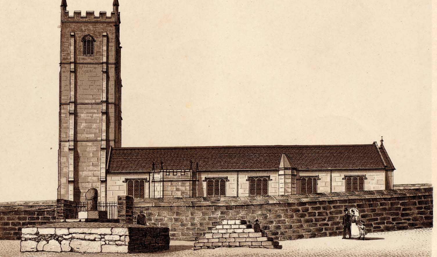 Description: An illustration of St Buryan Parish Church with its accompanying market cross and heapenstock for mounting horses. The costumes suggest an Edwardian time.