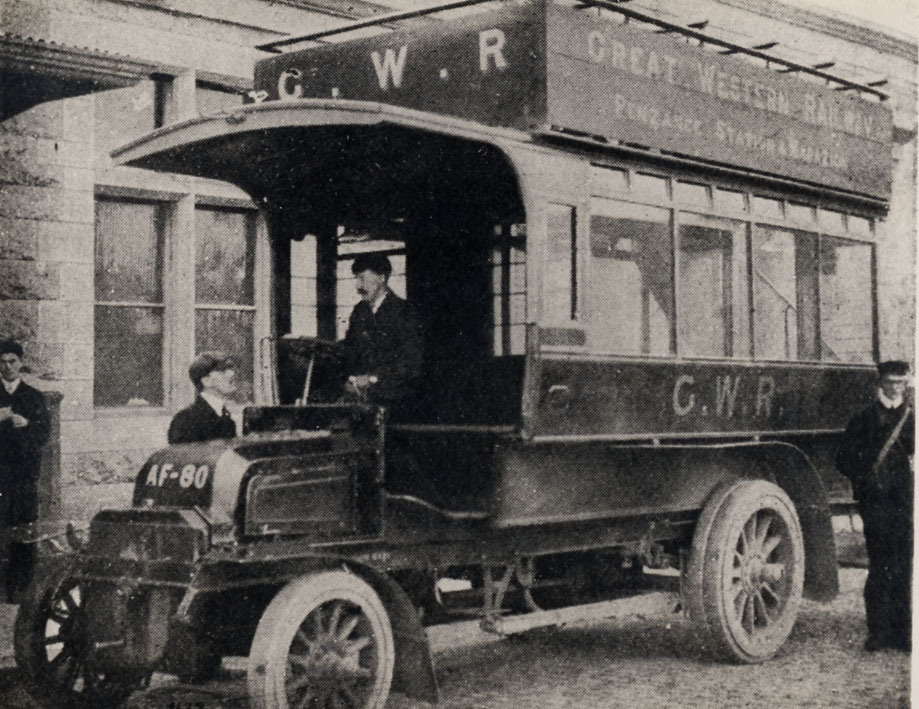 Description: The GWR double-decker bus ran between Penzance and Marazion 1903 to 1916. The vehicle registration is AF 80, it is a Milnes-Daimler 20hp 3 tons.