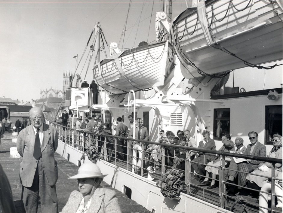 Description: Excursionists are enjoying the warmth of the sun on the upper deck of Scillonian II before sailing to the Isles of Scilly. The figure in uniform on the fore deck is Jock Quinlan, the Marconi Radio Operater, who operated the forward winch controls whenever the Scillonian sailed or docked.
