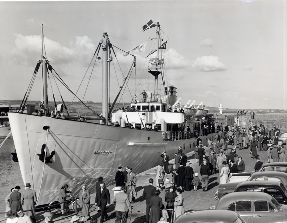 Description: It looks as though the ship is brand new. The number of people around suggests that it was the time when she was opened for public viewing. The writer remembers this as a lad. He was very impressed by all the new and shiny paintwork, woodwork and brass fittings. The cars on the quay include a Morris Oxford, a Ford, a Rover, an Armstrong Siddeley and a Vauxhall Wyvern. Scillonian II was built by J I Thorneycroft of Woolston, Southampton and Scillonian III was built in Appledore in 1977.
