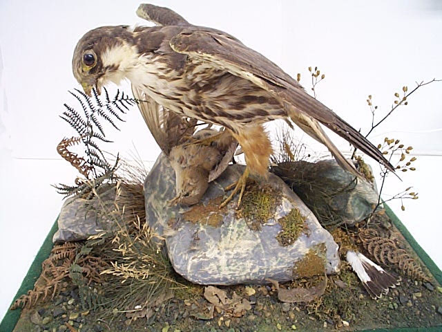 Description: Hobby holding a small bird in it's talons. Prey's tail feathers have come apart from the body.