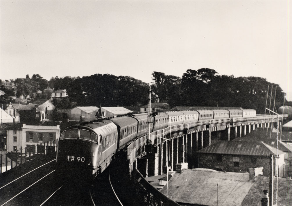 Description: A Diesel Hydraulic Warship of which 71 were constructed by Swindon Works and the North British Locomotive Company of Glasgow between 1958 and 1962. They were withdrawn in 1972 as the Railway Executive opted for Diesel Elecctric traction. Of interest in the train formation are 2 LMS sleeping cars which possibly came into Cornwall on a through Glasgow, Manchester to Penzance service as sleeping cars were conveyed only as far as Plymouth.