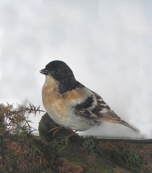 Description: Brambling in a glass case, mounted by Rowland Ward Ltd, London.