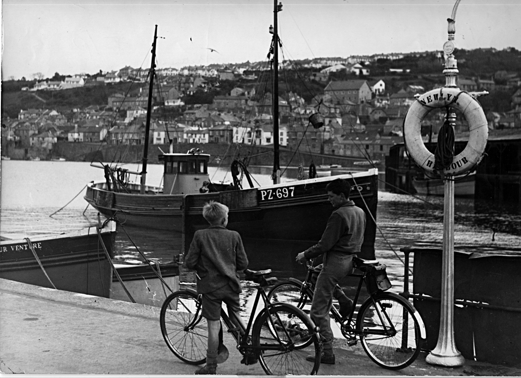 Description: This photograph, taken for the Town Guide shows Newlyn Harbour,in the early 1950s, shows the trawler PZ697 and two boys with gleaming bicycles. The bike to the right has its mudguard painted white, perhaps a left over from wartime when lighting was restricted. Centre right is part of the fish market with Newlyn Town Hall in the background. Our Katie has been fitted out for bottom trawling as signified by the steel gantries on her side decks and the fish basket hoisted on the forestay indicating her activities to other vessels when at sea.