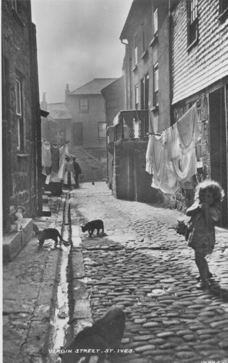 Description: Virgin Street looking towards the Digey and Fore Street. It looks like a washday Monday in summer; note the water running down the gutter. The outside steps lead to the fish cellars beneath the houses. Cats in Downlong St Ives were a popular postcard theme, but cats were kept to keep down vermin.