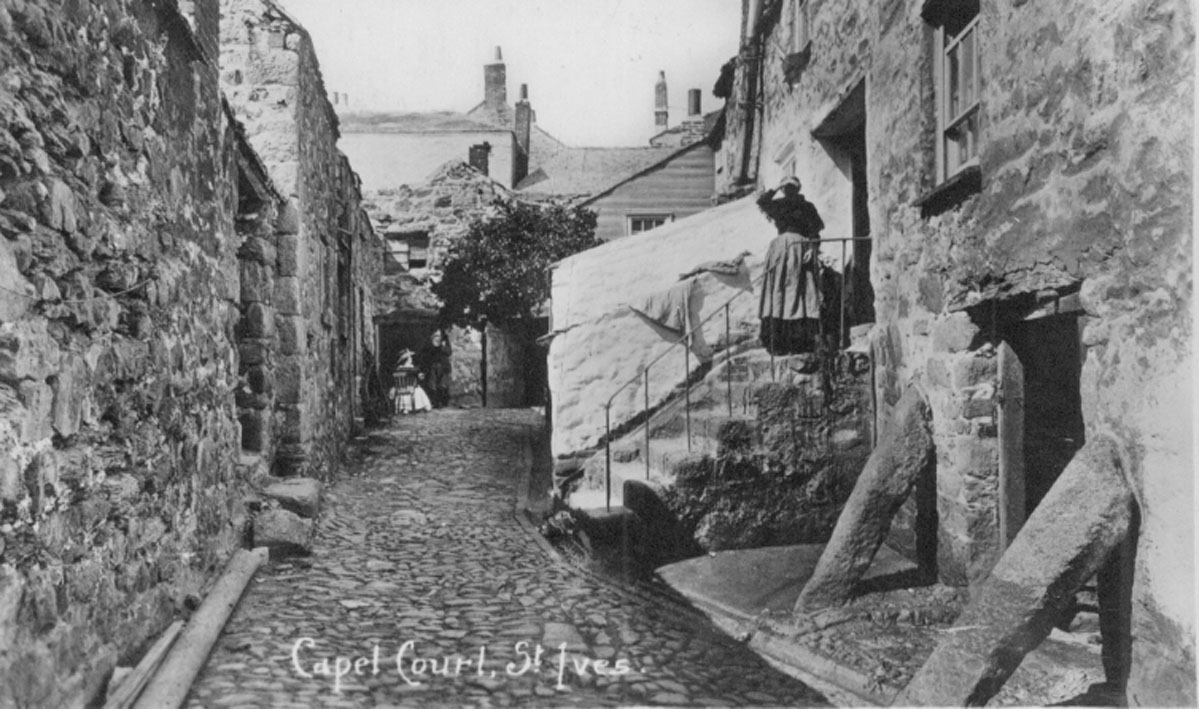 Description: Capel Court, known as Pudding Bag Lane, was demolished after much protest in the slum clearances of 1936. It became the site of the Sloop Car Park.