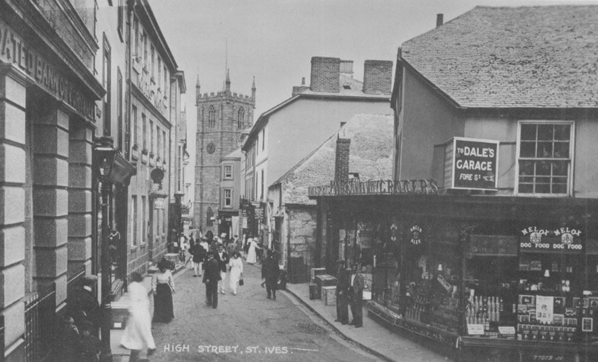 Description: High Street, St Ives in the early 20th century, certainly before 1920. The Bank of Cornwall and the Queen's Hotel is on the left, its stables opposite. The Scala Cinema was built on this site in 1920, a popular local flea pit, universally known as the 'scaler.' Dale's Garage is on the right with the Parish Church in the centre of the picture.