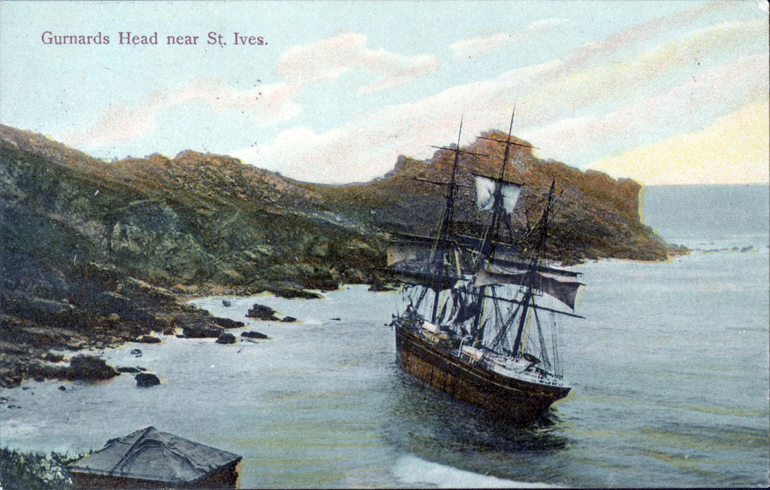 Description: A postcard with the script 'Gurnards Head near St Ives' in the top left hand corner. The Liverpool ship 'Alexander Yeats', for Devonport with deal and pitch pine from Savannah, broke away from the tug 'Gamecock' off South Wales and was wrecked near Gurnards Head on 25 September 1896. Her 19 crew were saved by breeches buoy. Much of her cargo was salved and taken to Penzance by traction engines. The 'Alexander Yeats' was built of wood at Portland, New Brunswick in 1876. Many wooden ships, cheaply built in the Canadian Maritimes were bought by UK owners.