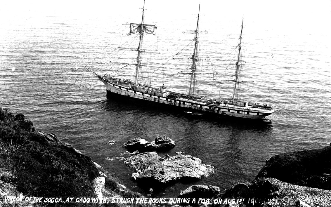 Description: A postcard with the script at the bottom of the card, 'The Socoa at Cadgwith struck the rocks during fog on 2 August 1906'. The 'Socoa' grounded at Kildonan Point on the Lizard in thick fog. She was from Stettin San Francisco with barrels of cement to rebuild the city after the earthquake. The 'Socoa' was refloated after 50,000 barrels of cement were jettisoned and beached at Cadgwith. She was subsequently repaired at Falmouth. In 1907, she was sold and renamed 'Thiers'. Laid up in 1921, she was scrapped in 1927. The 'Socoa' was built at St Nazaire in 1901. She was a 'Bounty Ship', part of a scheme by which France supported its merchant marine and shipbuilding.