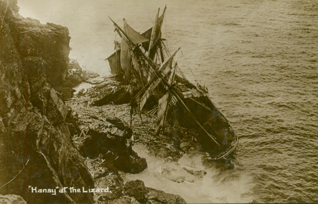 Description: 'Hansy' at The Lizard. This postcard, dated 15 October 1912 pictures the 1497 ton sailing ship Hansy of Fredrikstad at 1445 on 3 November 1911 which was wrecked at Housel Bay on the eastern side of the Lizard. 'She missed stays while trying to come about.' Three men were saved by the Lizard lifeboat and the rest, including the Captain’s family, were taken off by rocket apparatus. She was bound for Sydney with building material and her cargo of steel, pig iron and timber which was washed up for weeks afterwards. Two days later a salvage party boarded to find a pair of goats lying happily in a seaman’s bunk. Local fishermen did a thriving trade in timber for weeks afterwards and it is said that the iron pigs are fished up for ballast to this day.