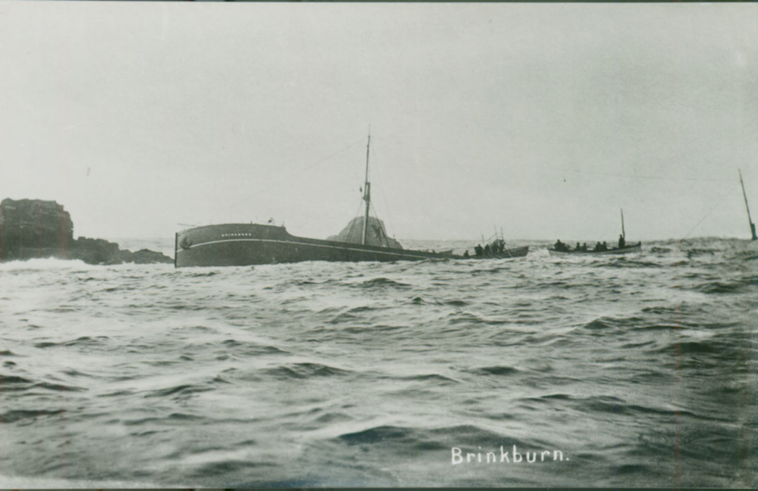 Description: The Brinkburn hit the Western Rocks, Isles of Scilly in fog on 15 December 1898. Her crew were rescued by boats from Bryher. The Liverpool Salvage Association in conjunction with the Western Marine Salvage Company attempted recovery of her cargo of cotton bales and cotton seed.