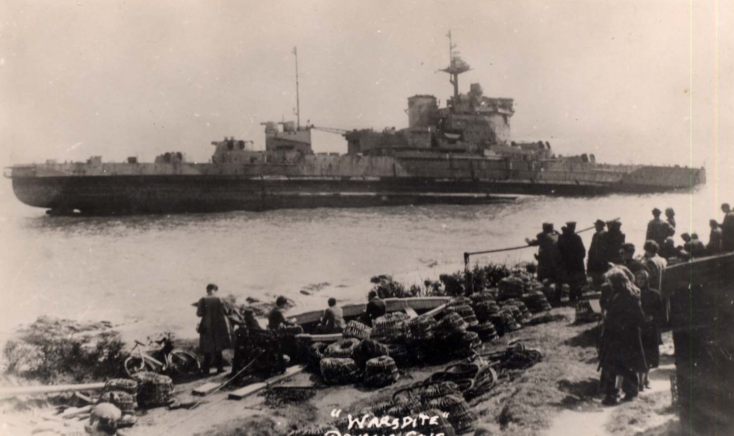 Description: HMS Warspite lies in Prussia Cove, having broken her tow to the breaker's yard. She had ran aground at Prussia Cove on 23 April 1947. There is a distress flare on the stern. She was re floated on the next day's tide.
