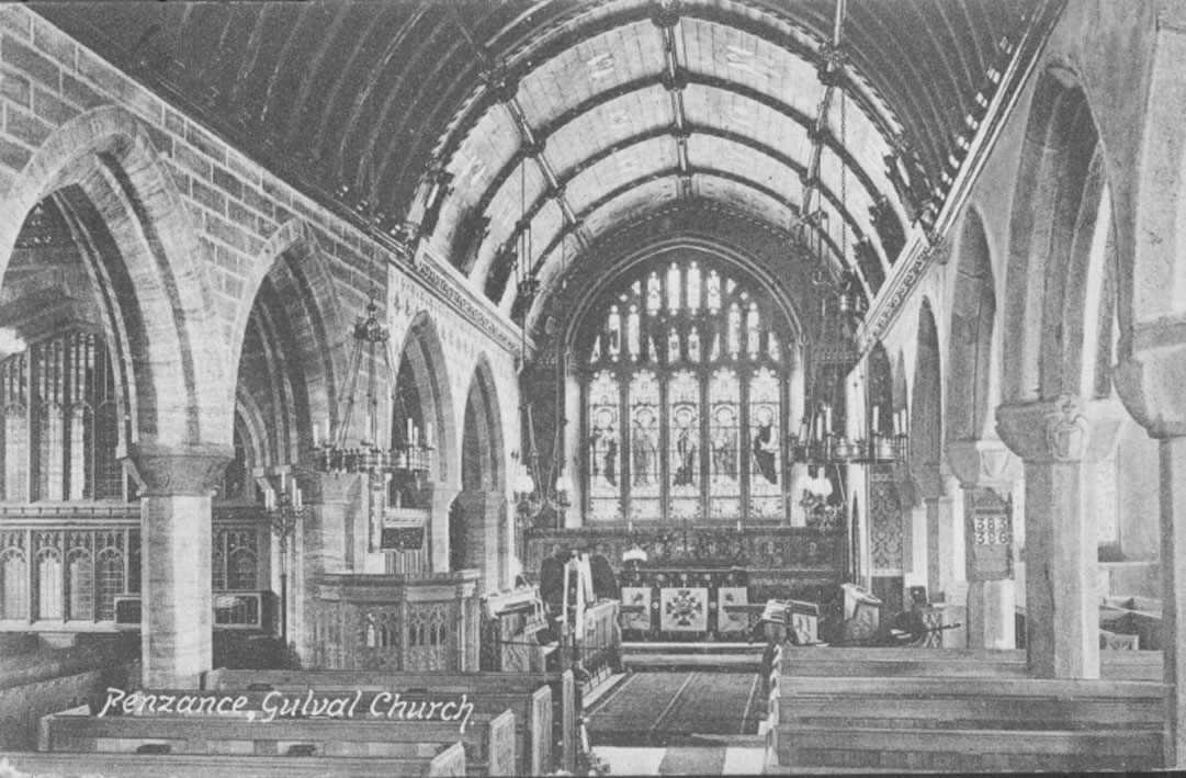 Description: Interior of Gulval Church, pre 1918. Centre left is Bolitho Chapel, built by R.F. Bolitho in 1892; it's pillars are Bath stone as opposed to granite used in old church. Chancel screen added in 1919 by R Bolitho in memory of his sister; the memorial reads 'To the glory of God and in loving memory of his beloved sister' - visitors are amused to find this unexpected addition to God's immediate family. The oil lamps were converted to electricity in 1926 when the church had its own power plant installed. Prior to this the organ was powered by water taken from the reservoir behind the church which drove a dynamo which in turn ran the bellows.