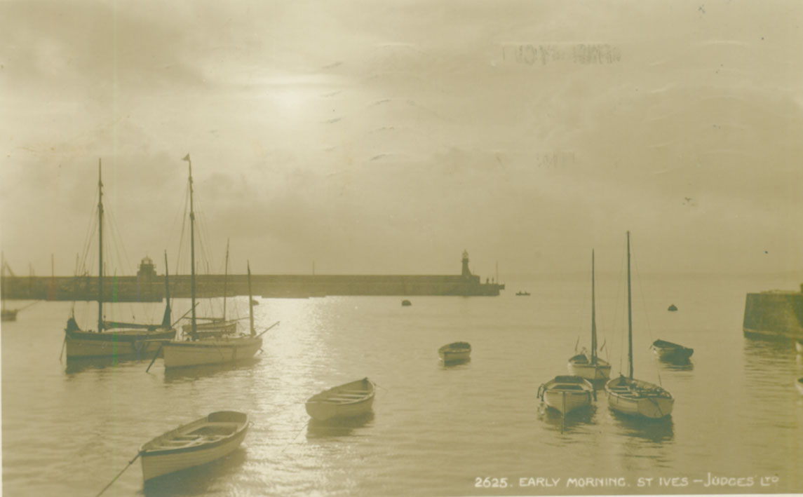 Description: St Ives Harbour from the Promenade or Wharf Road in the 1920s. There are two pleasure boats (ex fishing boats) to the left. The boat near the bottom of the picture is believed to be the Hyacinth; Also pictured are the T Daniel, an ex Mousehole pilchard boat PZ2307. In the right foreground are skiffs and sailing skiffs. The West Pier is to the right, Smeaton's Pier to the left.