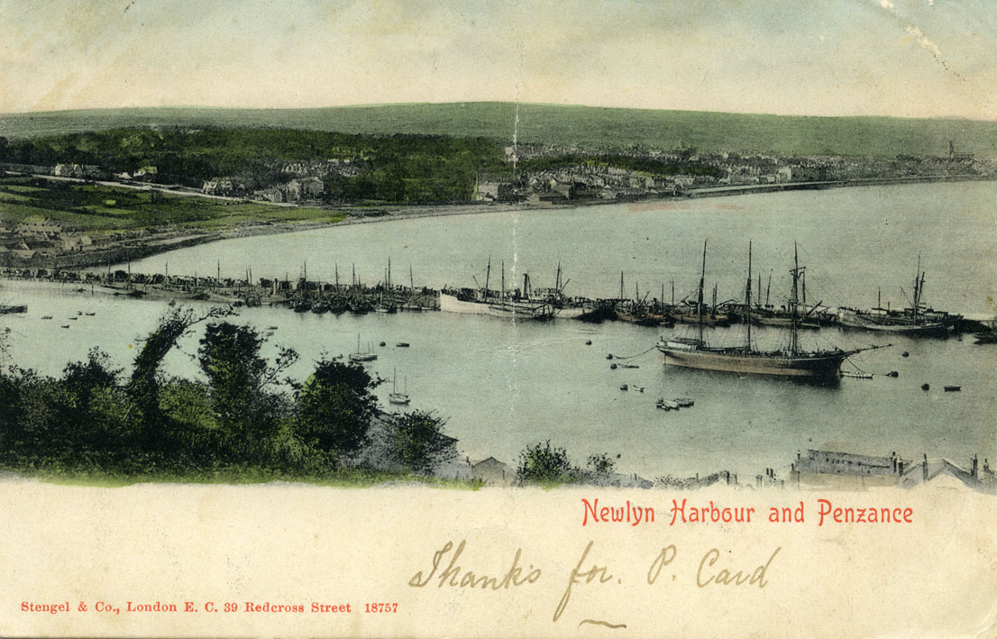 Description: This scene is at the junction of the slip and Fore Street. The cellar below the house with a tall chimney was a large pilchard pressing plant. The masts of a Mounts Bay lugger can be seen alongside the pier. The South Pier was built on a reef known as Green Rocks.