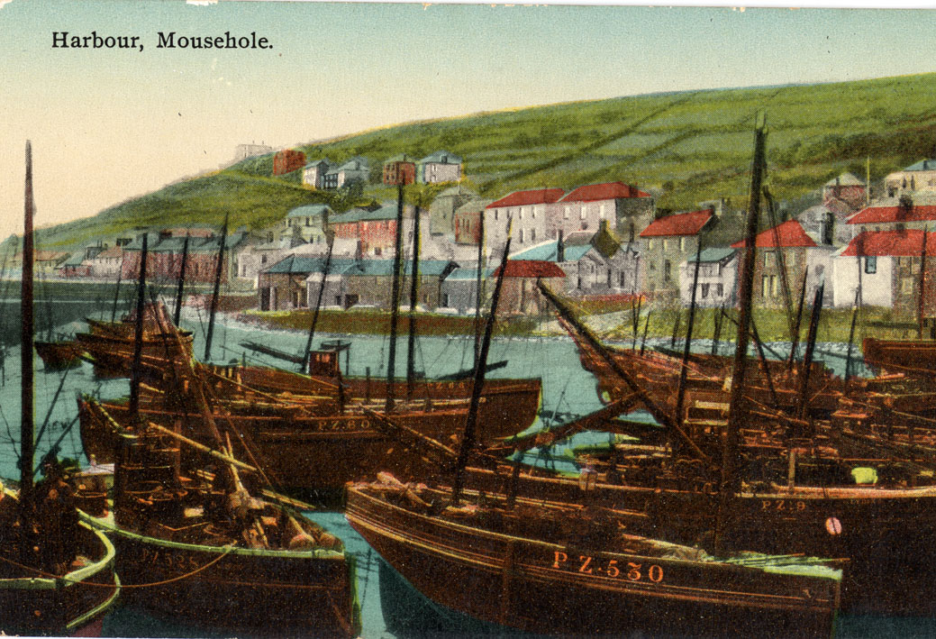 Description: This vividly coloured postcard depicts fishing boats of the 1920s in Mousehole Harbour. Left to right lie the fishing boats PZ528 Boy Fred; PZ2530 Volunteer with long lines in baskets and a furled lug foresail; PZ602 Boy Willie; PZ9? The boats are carrying long lines so it is likely to be before the pilchard season in Spring or early Summer.
