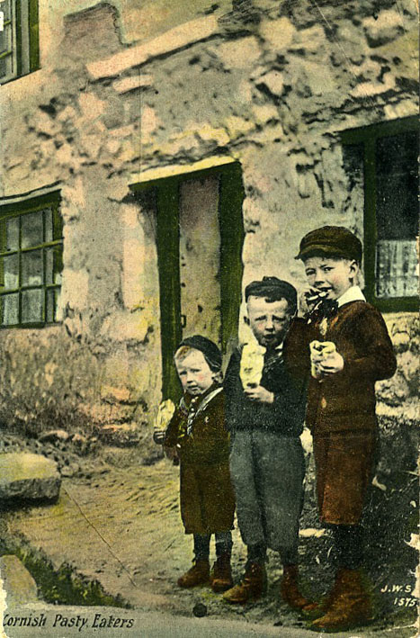 Description: Three clean, well dressed and booted boys present a healthy image of Cornish children. The pasties are full of meat. The three boys are from the Laity family.