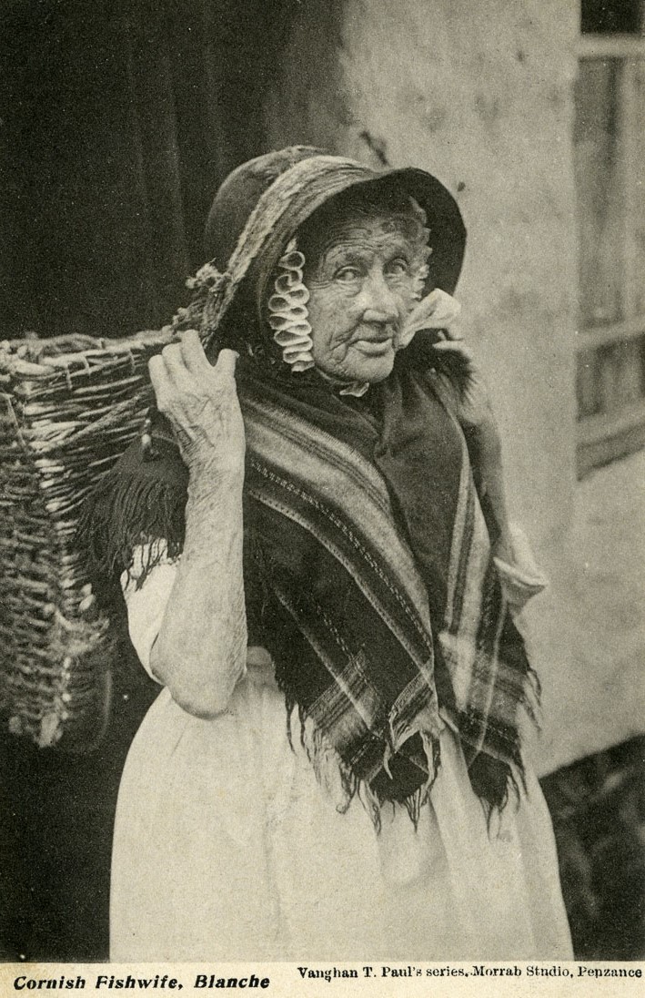 Description: This is one of Vaughan T Paul's series of postcards recording the local fishing industry. Blanch Courtney was a very popular model for local photographers and for the Newlyn School of Painters. Note here the Paisley scarf, usually a gift brought back from Scotland by local fishermen. This would be worn as Sunday best and not used to absorb the fish oil and seawater seeping through the basket. The apron is in pristine condition: the basket is not secured around the waist as it would be if the basket were full of fish. Blanch earned a living as a hawker of fish in the countryside around Newlyn. Born in 1818, Blanch Leah Tonkin was christened at Paul Church on 3 May. In November 1840 she married Robert Courtney who was a Coastguard. They moved away from Newlyn for several years. Blanch returned in 1845 after he died aged 27. He is buried at Paul. Blanch lived in St Peter's Hill before moving to 9 Church Street for the rest of her long life.
