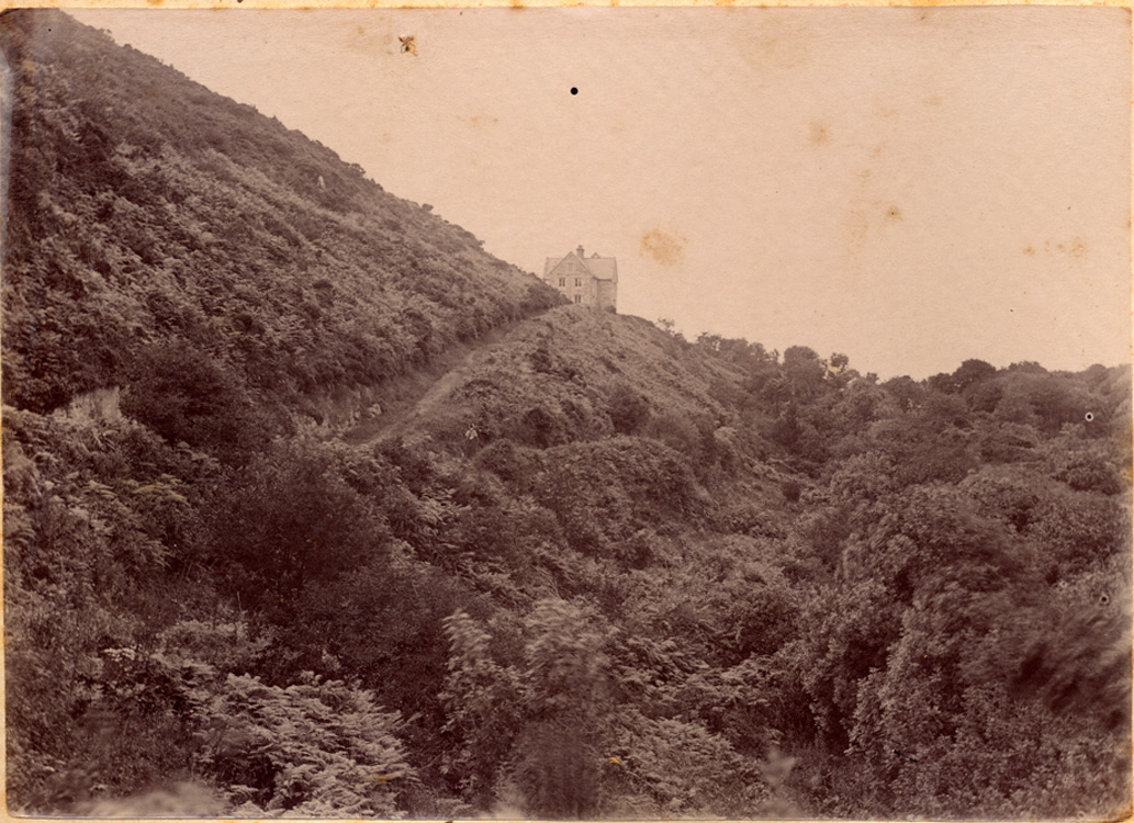 Description: A photograph of Lamorna; an area of green vegetation, with a house in the background.