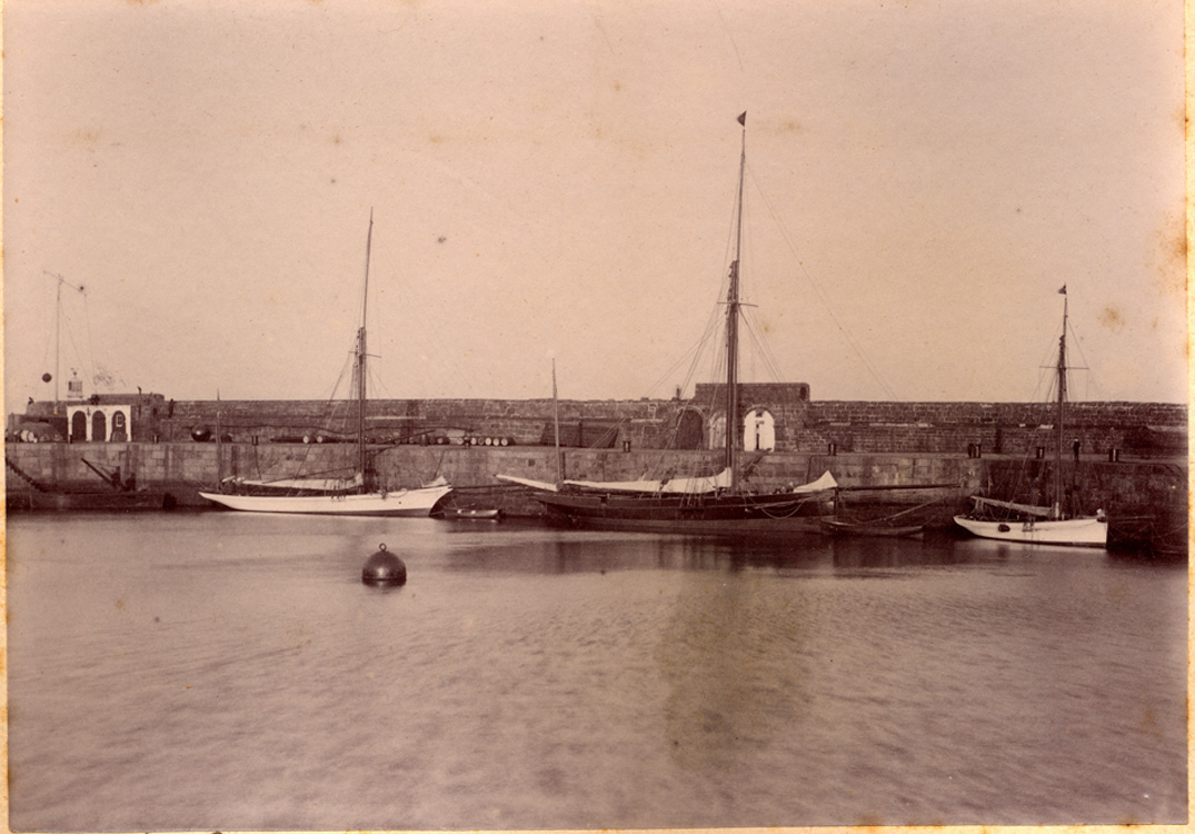 Description: A photograph of three yachts in the central dock of the South Pier of Penzance harbour. In the foreground, a buoy floats in the water. The 'Oenanthe' is situated to the left. The lighthouse can be seen in the background to the far left. The yacht 'Jullanar' of 1875 popularised the yawl rig left and centre.