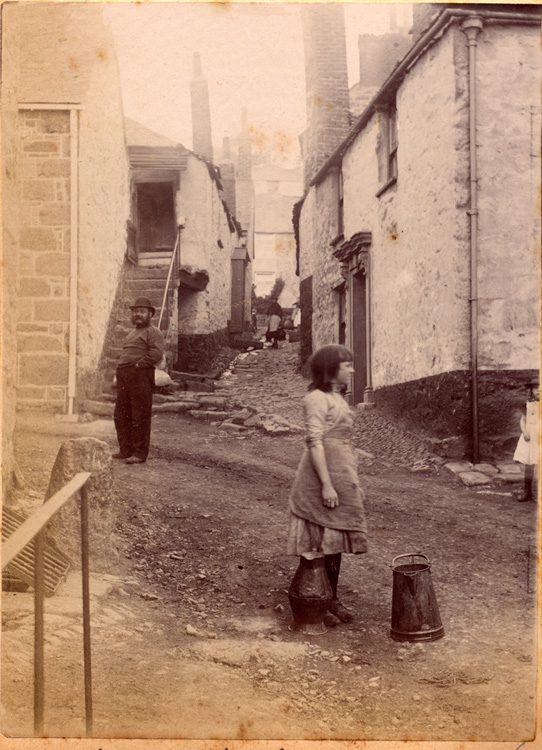 Description: A photograph of a cobbled pathway leading from a street in Newlyn. On the left are a flight of granite steps leading to an upstairs door. A young girl stands in the centre of the street looking elsewhere with a milk churn on the floor by her side.A man, possibly a fisherman, stands to the left looking at the camera, wearing a bowler hat and having a thick beard and moustache. A small girl, half obscured, stands to the right.