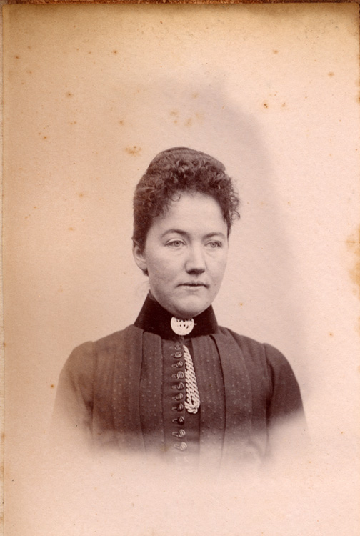 Description: A portrait photograph of Edith Branwell, second daughter of JR and Elizabeth Branwell, who lived at Penlee House. She stands in front of a white background wearing a high necked dress with buttons.