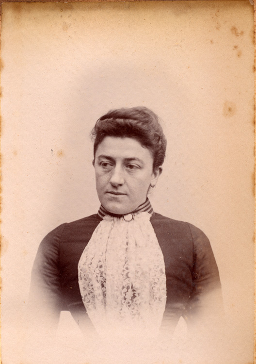 Description: A portrait photograph of Marion Mudge, nee Branwell, third daughter of JR and Elizabeth Branwell, who lived at Penlee House. She stands in front of a white background wearing a high necked dress with decorative lace.
