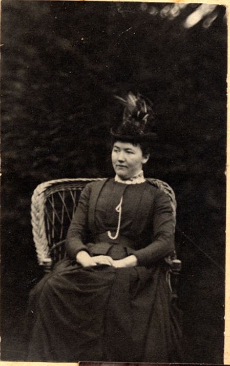 Description: A photograph of Edith Branwell, second daughter of JR and Elizabeth Branwell, who lived at Penlee House. She wears a hat with feathers and sits on a wicker chair, most probably within the grounds of Penlee House. The same wicker chair is used as in PEZPH :1993.43.5, PEZPH :1993.43.8 and PEZPH :1993.43.9.