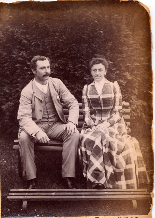 Description: Marion Mudge, nee Branwell, with her husband, John Mudge, sitting on a wooden bench, which also has a foot rest, within the grounds of Penlee House. Marion was the third daughter of JR and Elizabeth Branwell, who lived at Penlee House.