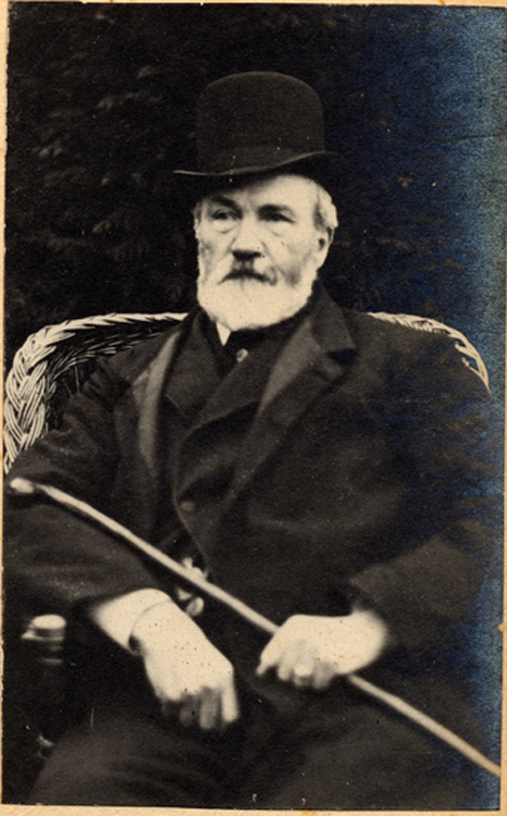 Description: A photograph of JR Branwell, who lived at Penlee House. He wears a top hat, holding a stick, and sits on a wicker chair, most probably within the grounds of Penlee House. The same wicker chair is used as in PEZPH :1993.43.5, PEZPH :1993.43.8, PEZPH :1993.43.9 and PEZPH :1993.43.14.