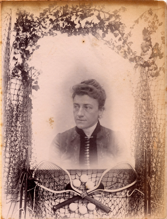 Description: Portrait photograph of Marion Mudge, nee Branwell. Marion was the third daughter of JR and Elizabeth Branwell, who lived at Penlee House. John Branwell, the photographer, has used two different negatives and developed them as one photograph. Therefore, Marion is framed by vines, fishing nets and to the bottom, two crossed tennis rackets with six tennis balls.