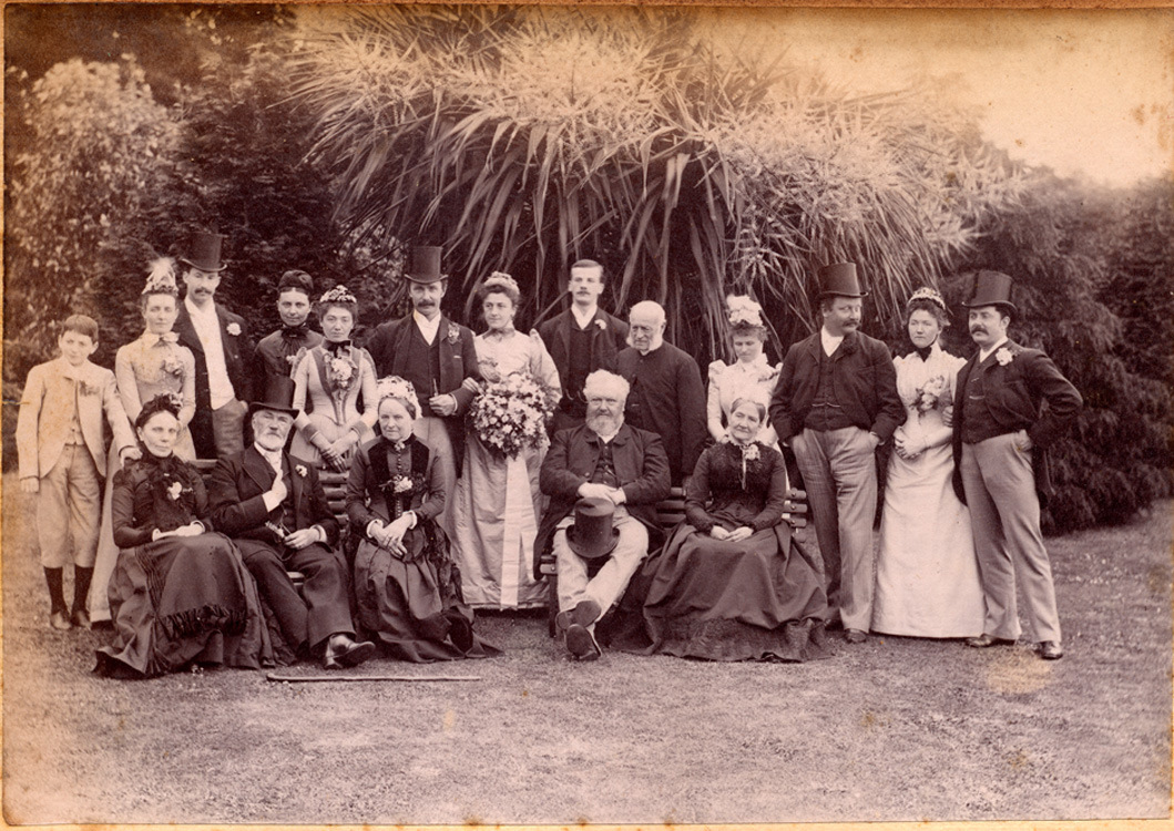 Description: A second photograph of the marriage party to celebrate the matrimony of Marion Mudge, nee Branwell, and John Mudge. Marion was the third daughter of JR and Elizabeth Branwell, who lived at Penlee House. They stand within the grounds of Penlee House. JR Branwell sits bottom row, second from the left with his wife Elizabeth furthest right. John Mudge's mother and father sit either side of the couple. Laura Branwell stands next to John Mudge whilst Edith Branwell stands in the second row, second in from the right. Behind Marion stands (left to right) Alfred Branwell. A Clergyman stands in front of him. In contrast to PEZPH : 1993.43.153, John Branwell is now taking the photograph, as he is now absent from the picture. Elizabeth Trewhella dates this photograph to approximately 1895.