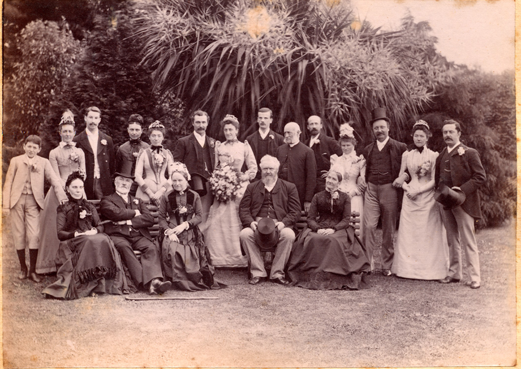Description: A third photograph of the marriage party to celebrate the matrimony of Marion Mudge, nee Branwell, and John Mudge. Marion was the third daughter of JR and Elizabeth Branwell, who lived at Penlee House. They stand within the grounds of Penlee House. Seated left to right - possibly a grandmother from either side, JR Branwell, Mrs Mudge, Mr Mudge and Elizabeth Branwell. Standing left to right - Possibly Herbert Thomas, three unknown people, Laura Branwell, John and Marion Mudge, Alfred Branwell, Clergyman, John Branwell, unknown couple, Edith Branwell and an unknown man. Elizabeth Trewhella dates this photograph to approximately 1895.