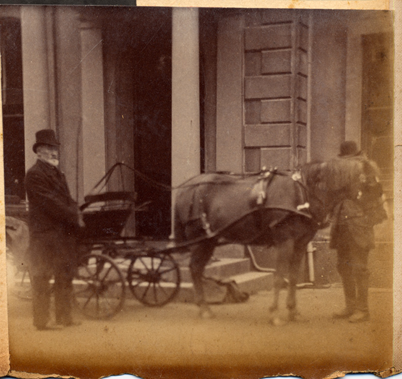 Description: A photograph of JR Branwell, who lived at Penlee House. He stands in front of a horse and carriage outside the front door of Penlee House. Another man stands to the right, whose identity is masked by the horse.
