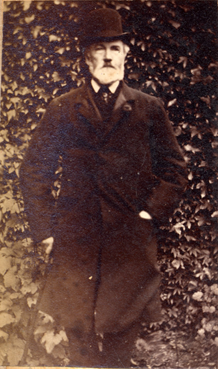 Description: A photograph of JR Branwell, who lived at Penlee House. He stands in front of a hedge within the grounds of Penlee House.