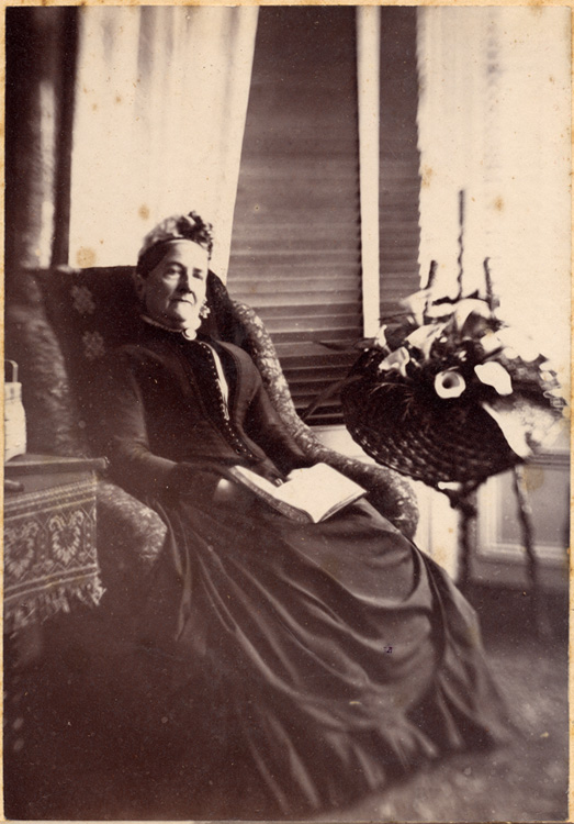 Description: A photograph of Elizabeth Branwell, wife of JR Branwell, who lived at Penlee House. She sits in a wicker chair, inside the drawing room at Penlee House. This photograph was taken at the same time as PEZPH : 1993.43.21, but she is looking more towards the camera and the image has been developed to a higher quality.