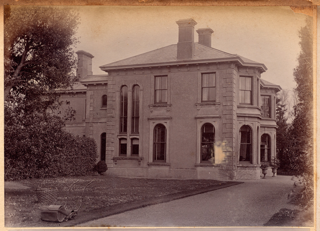 Description: A photograph of Penlee House (west side), with the lawn in front. In the right hand window of the drawing room can be seen Marion Mudge, nee Branwell, third daughter of JR and Elizabeth Branwell, who lived at Penlee House. A manual lawnmower stands in the foreground with a wicker basket.