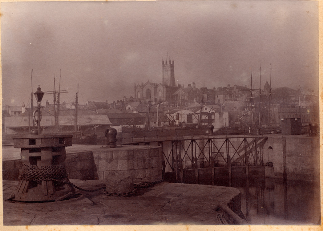 Description: A photograph of Penzance pier, looking towards the dry dock. In the foreground is a capstan. In the background, stands a number of lugger boats, with a view of St Mary's Church, the engineering works and the fish market to the left and Abbey Warehouse to the left.