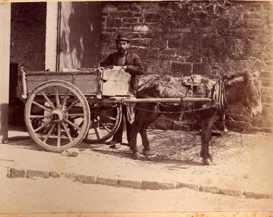 Description: A hawker or fish jouster with his wooden cart drawn by a donkey. They stand on a built-up granite pavement just outside a store, at an unidentifiable location. The Jouster's cart was widely used from the 1860s to post WW1. A stone on the near wheel and wooden blog (a trig) on the far wheel keep the cart stationary. 'A Fish Sale on a Beach' - Stanhope Forbes' shows the jousters carts in the background.
