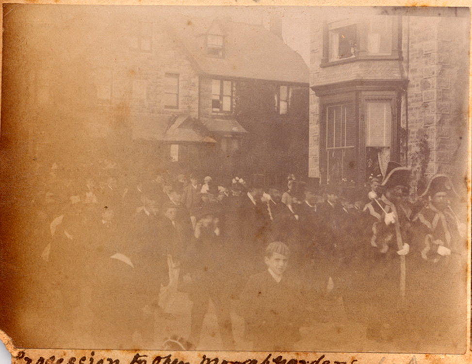 Description: This is a photograph of the procession to open Morrab Gardens going down Morrab Road, with Morrab Terrace in the background. In front are the mace bearers with the Mayor, William Francis Rowe and dignitaries behind them. In the foreground there are a number of school boys.