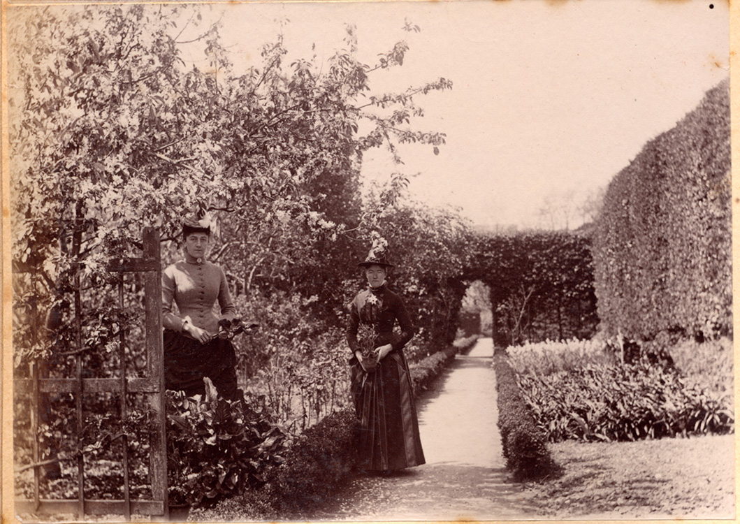Description: A photograph of (left to right) Marion Mudge, nee Branwell and Edith Branwell, second and third daughter of JR and Elizabeth Branwell, who lived at Penlee House. They stand within the walled garden, each holding a plant.